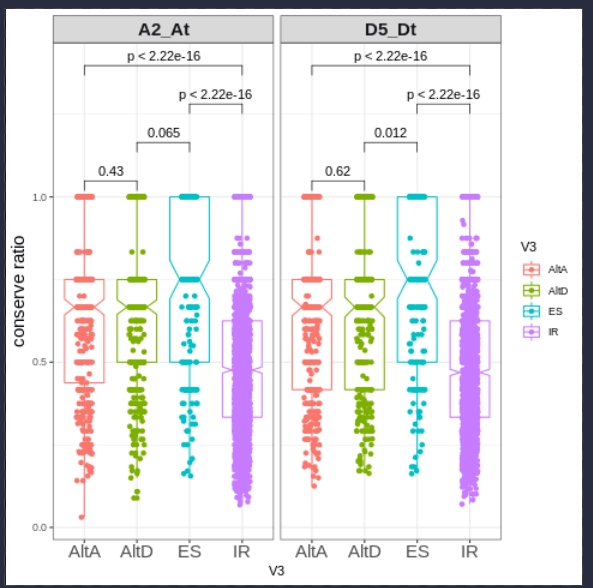 分析A2与D5中保守的剪切事件,在At、Dt中的保守情况 1. A2 D5中保守,在At与Dt中同样保守 2. A2 D5中保守,在At与Dt中不保守