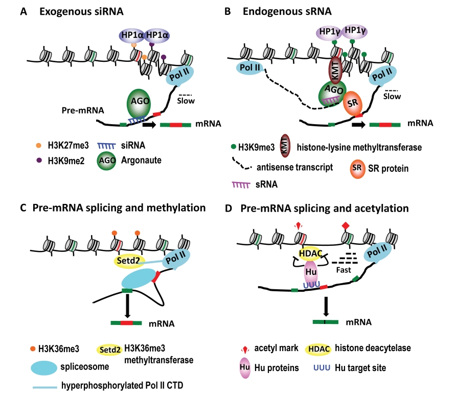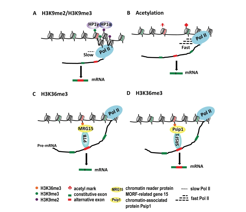 各种组蛋白标记通过招募一些蛋白,影响RNA聚合酶Ⅱ的移动速率,影响可变剪切复合体的识别