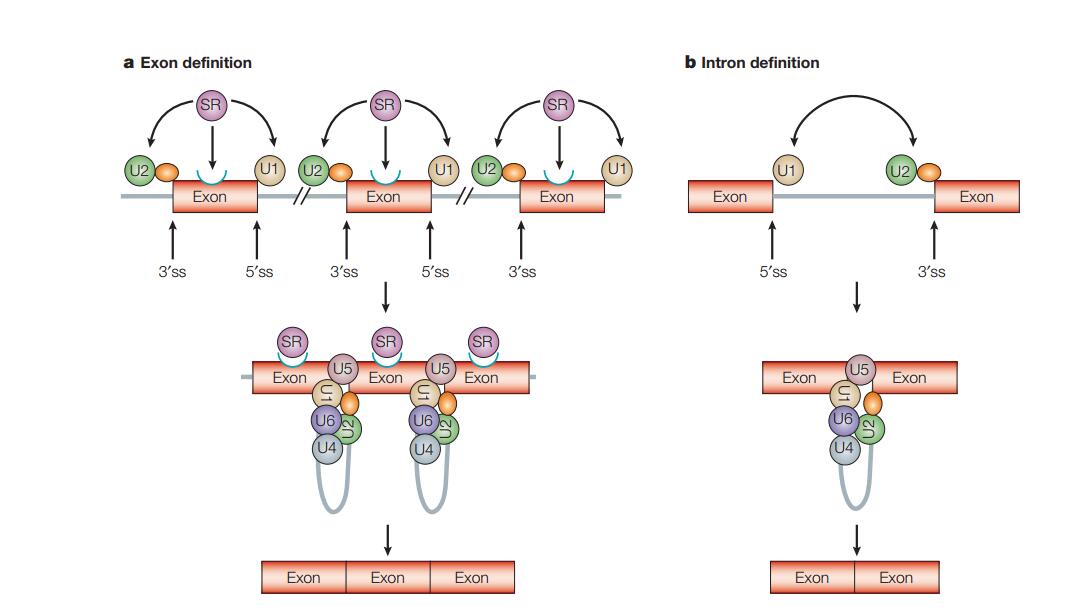 例如SR 蛋白通过结合到 contitutively splice exon上,弱化选择亚,使得这些exon附近的剪切位点能够发生突变形成weak splice site。这两个模型并不存在冲突,第二种模型还只是一个猜想没有很多实验的证明。