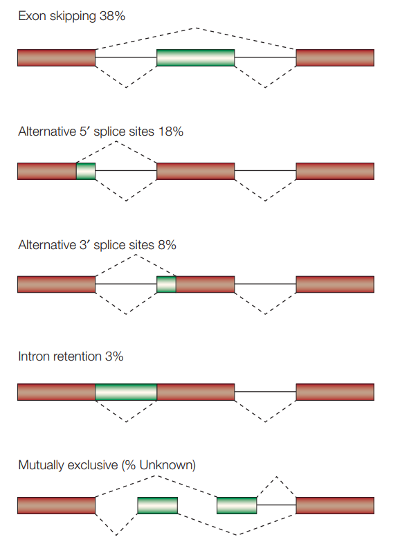 人类中基因的平均长度大约在28000个核苷酸,每个基因约8.8个外显子,每个外显子长度约为120bp,被7.8个内含子间隔开。虽然外显子相对于内含子很小,但是剪切机制仍旧能够精确的识别外显子,剪切掉内含子,形成成熟的mRNA。每个基因如此多的外显子,也使得剪切机制能够在单个基因上剪切不同的exon,产生不同的mRNA。在人类中大约有~26000个基因复杂编码90000多个蛋白质。