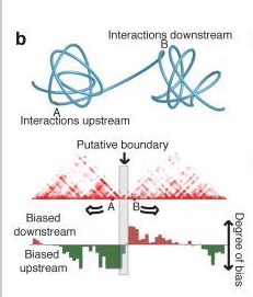 通过定义100Kb的bin去扫描时整个染色体时,出现一些非常高的交互区域,被称为TAD,紧接着一段比较短的片段,这个短片段内的交互戛然而止,因此作者猜想这种交互作用的突然变化,可能是TAD的边界区域,将基因组内的TAD分隔开来。