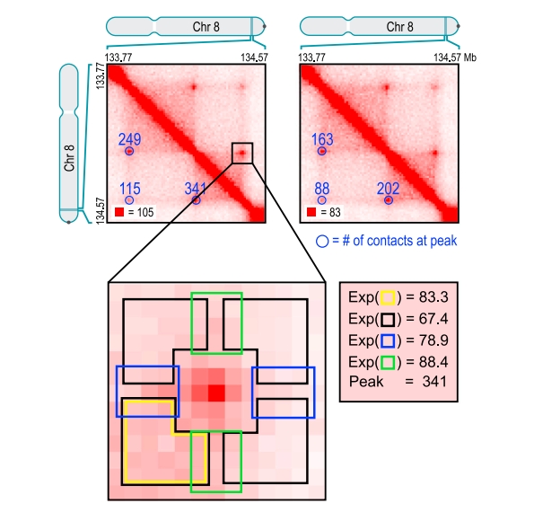 通过比较与局部比对的read进行比较,发现显著性的peak,这里的pixels也就对应了一个matrix resolution的大小,与此同时作者开发了一套鉴定染色体loop的流程juicer-tools。