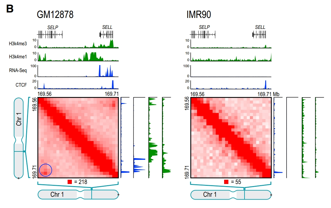 同时分析了人类和老鼠中的一个基因SELL,在人类中SELL存在loop(左图,蓝圈);而老鼠中不存在loop;人类中SELL是表达的,而老鼠中不表达。