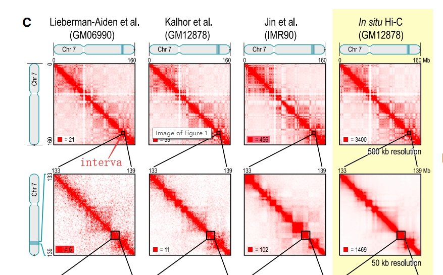 通过将染色体拆分成固定大小(10K,100K,1M)的连续片段,通过统计两两片段间交互的频率就可以得到一个二维矩阵M~i,j~,i和j当然代表染色体不同的两个位置