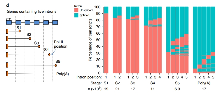进一步对处于elongating中的full-read 分析发现,有将近20%的read,存在至少一个已经剪切的intron,而有50%的内含子,在聚合酶II跨过3’剪切位点1100bp后,仍旧没有被剪切掉。