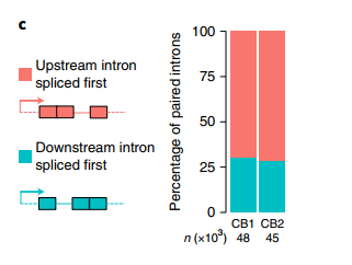由于文章的方法能够同时追踪来自同一个转录本的多个intron的状态,作者比较了任意两个相邻的intron的剪切顺序,发现有70%是上游的intron先发生剪切。