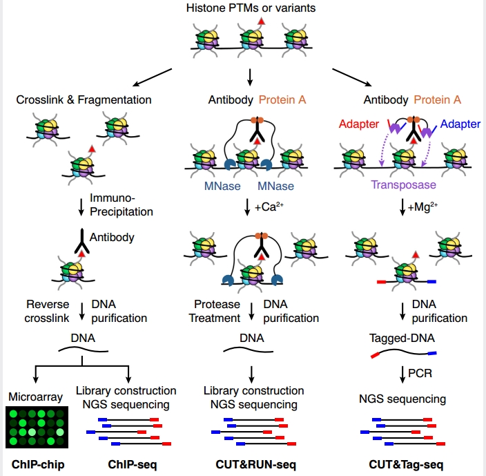 通过ChIP-seq、CUT&RUN-seq或者是CUT&Tag-seq能够揭示全基因组范围的组蛋白修饰;但是这里存在一个争论:组蛋白修饰能够指导RNAPII的转录,但反过来RNAPII的活动也能够塑造染色质的 landscape;或者这两者之间存在着反馈调节作用。
