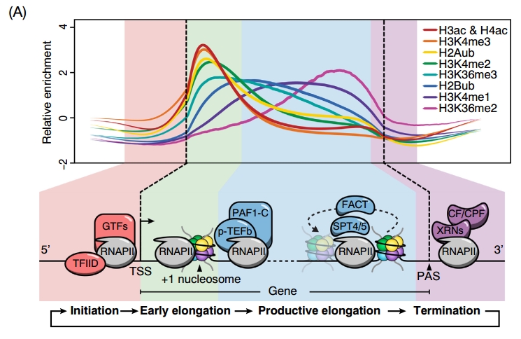 与此同时在转录的过程中还有一些共转录事件在进行着,例如 5’加帽,剪切、多聚腺苷酸化。那么RNAPII又是如何在对应的位置进入正确的阶段呢?有趣的是,通过CHIP-seq数据分析发现,组蛋白修饰的出现与不同的转录时期存在一定的关联,因此基因区域的组蛋白修饰可能是指导RNAPII进行正确转录的一种位置信号。