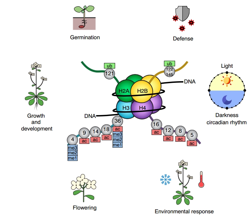 在真核生物中,基因组被组装在核小体内,而核小体又由组蛋白八聚体组成(H2A、H2B、H3、H4);组蛋白的N端氨基酸通常会经过多种的翻译后修饰(PTMs),其中就包括甲基化、乙酰化、泛素化,这些组蛋白修饰把染色质结构和基因表达联系起来。